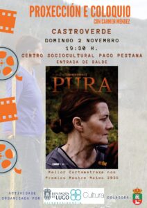 O DOMINGO DÍA 02 DE NOVEMBRO DE 2025 ÁS 19:30 HORAS NO CENTRO SOCIOCULTURAL PACO PESTANA TEMOS A PROXECCIÓN E POSTERIOR COLOQUIO DA CURTAMETRAXE “PURA”; PREMIO MESTRE MATEO 2025.